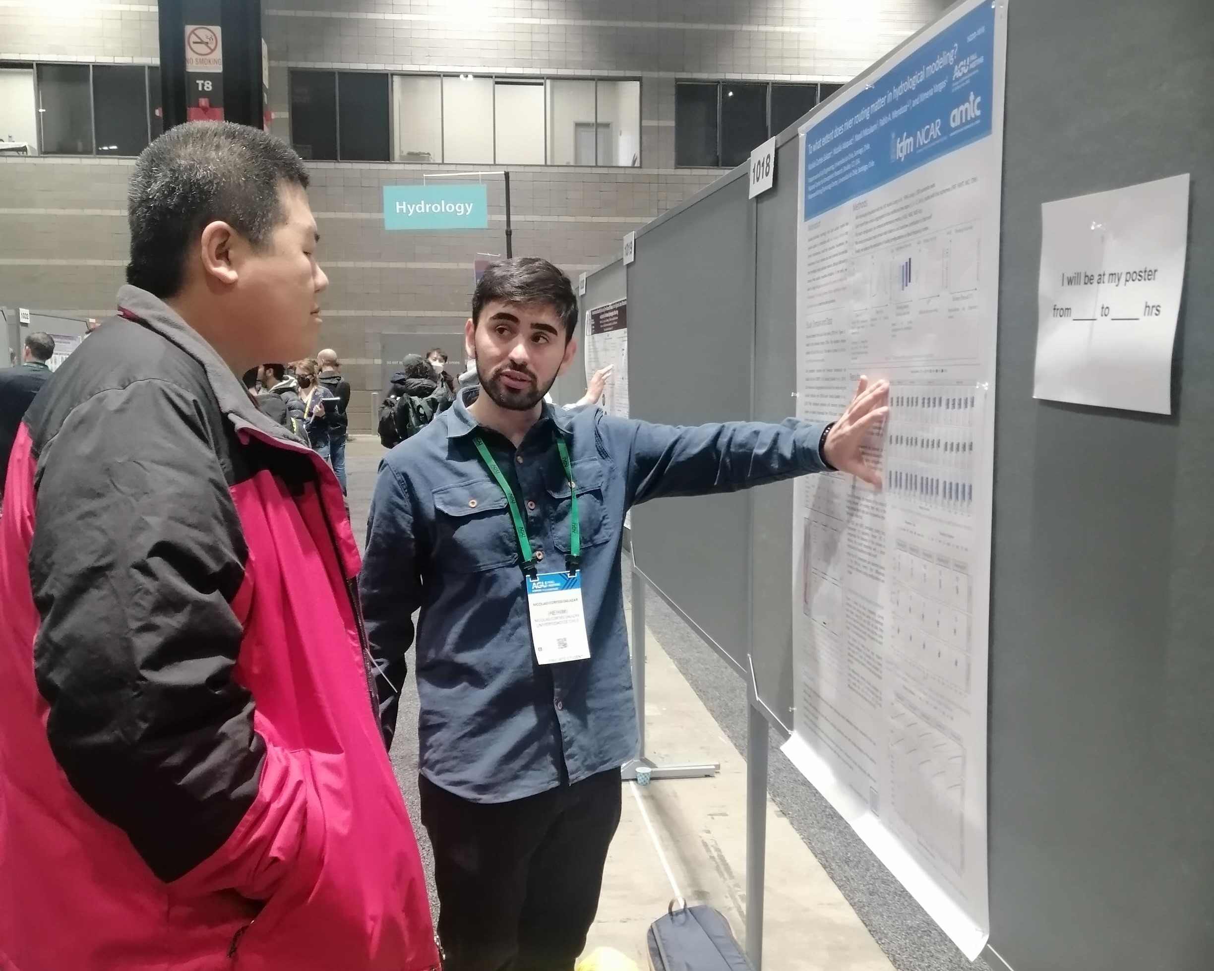 Durante la sesión de posters, Nicolás Cortés, estudiante de Magíster en Ciencias de la Ingeniería, mención Recursos y Medio Ambiente Hídrico, presentó su trabajo “To what extent does river routing matter in hydrological modeling?”; mientras que Nicolás Vásquez, estudiante de doctorado en Ingeniería Civil, presentó la investigación “Effects of Calibration Metric Selection and Regularization Strategies on Simulated Spatial Patterns”