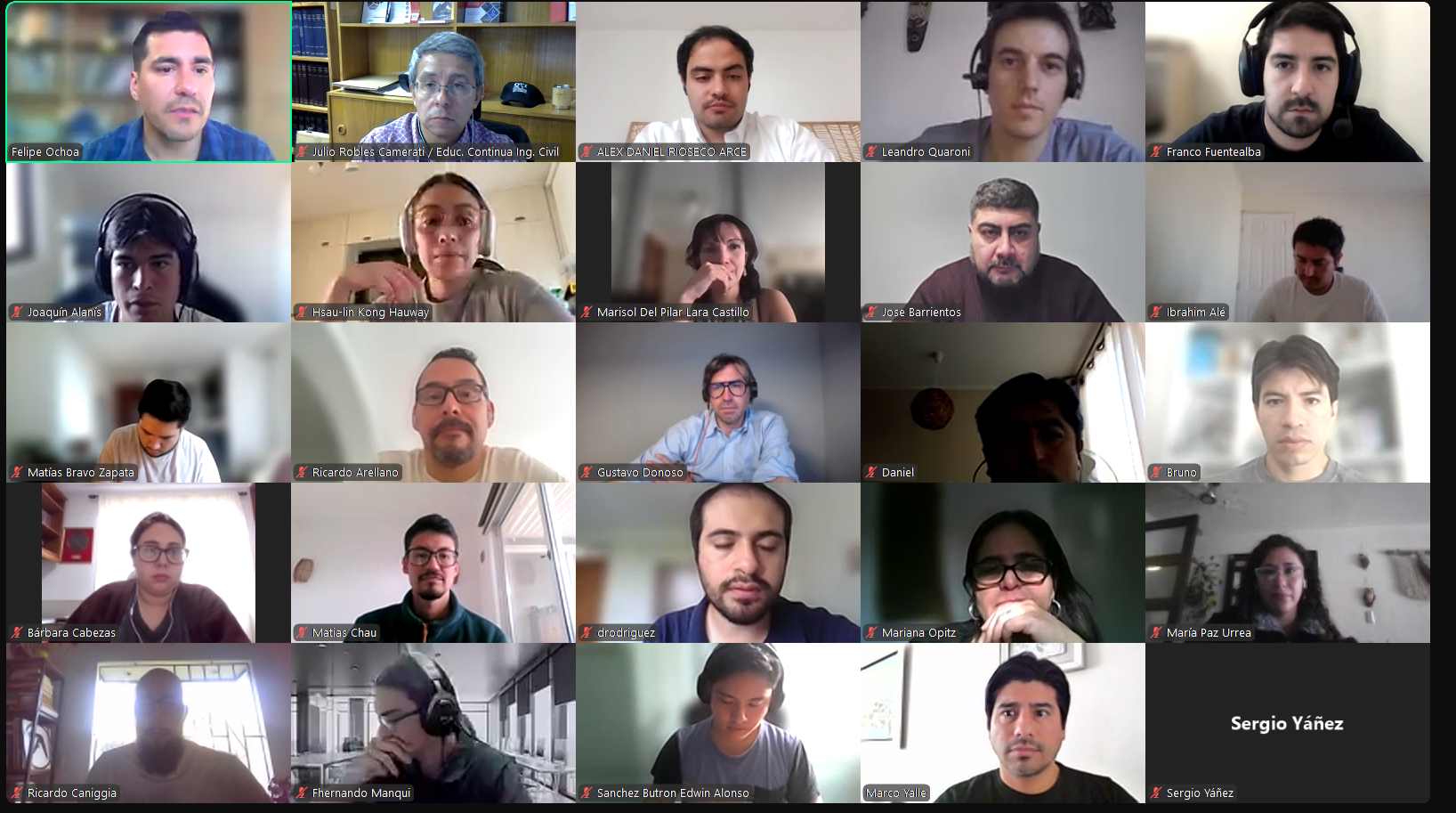 La sesión inaugural fue encabezada por el profesor Felipe Ochoa, Coordinador Académico del diploma, quien entregó un saludo de bienvenida a las y los estudiantes, destacando el carácter internacional y técnico del grupo. Luego, presentó a la profesora Marisol Lara, académica de nuestra facultad, quien estuvo a cargo de comenzar el primer curso del programa: "Geología aplicada a la ingeniería".