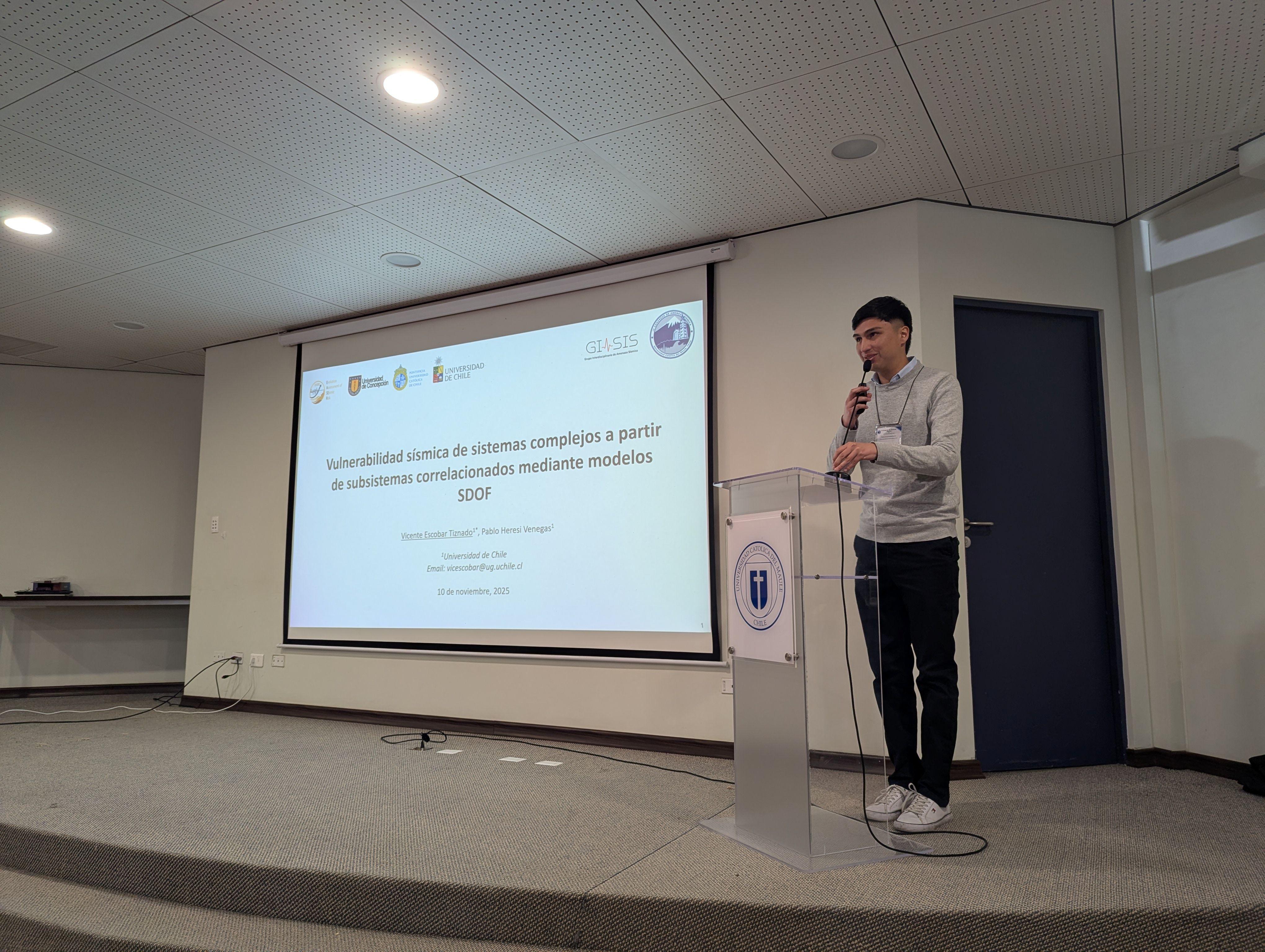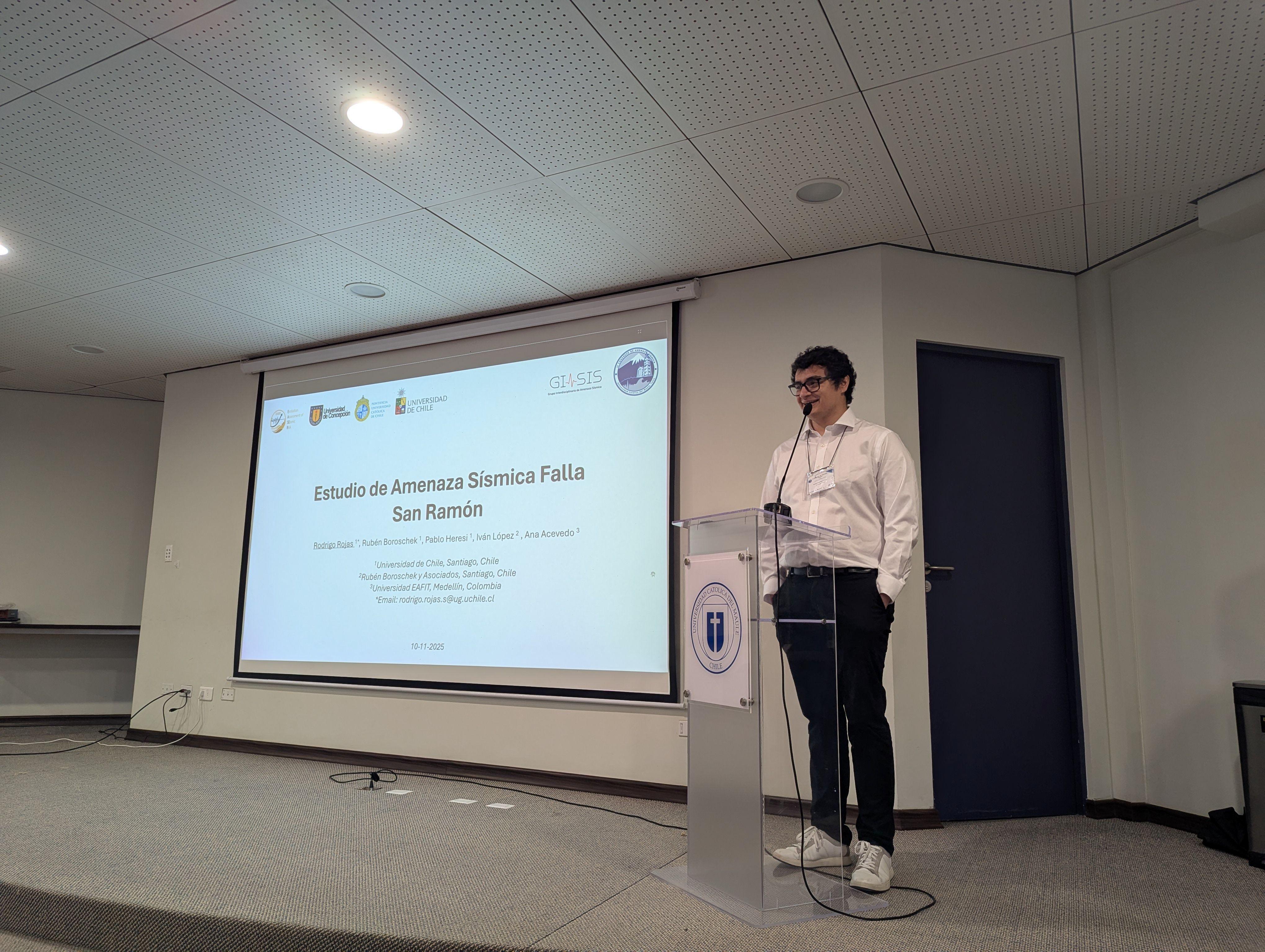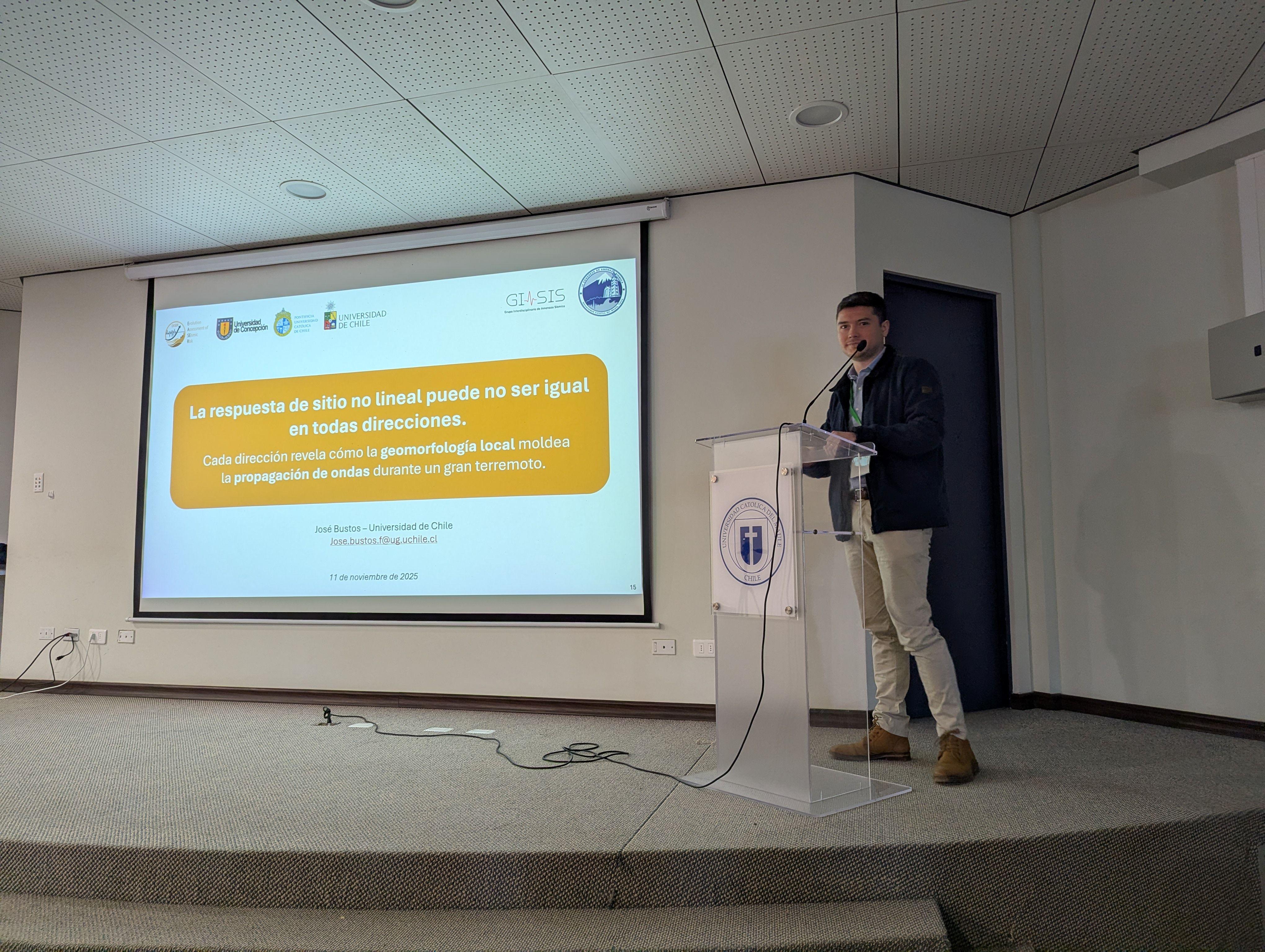 La participación del Departamento de Ingeniería Civil de la Universidad de Chile fue especialmente destacada, con seis estudiantes presentando sus investigaciones. Entre ellos, José Ignacio Bustos, ingeniero civil y magíster por la Universidad de Chile, quien actualmente finaliza su doctorado en Ingeniería Civil, presentó uno de los capítulos de su tesis doctoral, enfocado en la respuesta sísmica del sitio y el modelamiento numérico de cuencas sedimentarias. Sobre su experiencia, Bustos señaló que “presentar en este tipo de instancias te obliga a contrastar tu investigación con la de otros grupos, recibir comentarios que realmente te hacen pensar y, sobre todo, conocer gente que está trabajando en líneas parecidas”, destacando además la importancia de aprender a comunicar ideas complejas de manera clara, tanto para la academia como para la práctica profesional.
