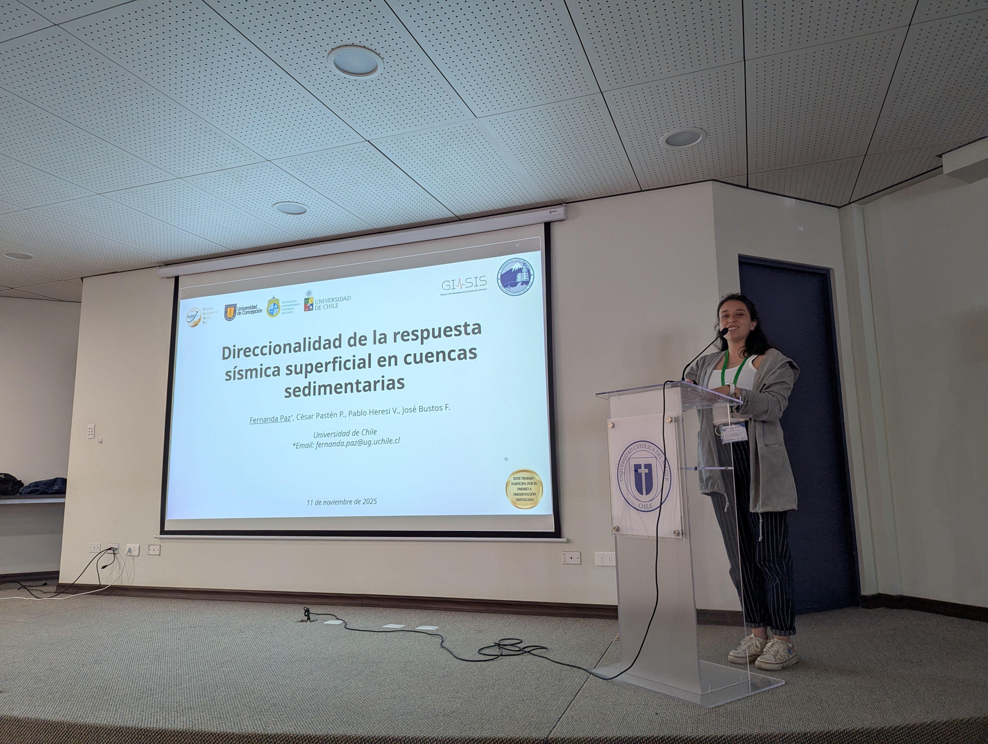 También destacó la participación de Fernanda Paz, estudiante del Magíster en Ingeniería Estructural, Sísmica y Geotécnica, quien presentó avances preliminares de su investigación en respuesta sísmica del sitio, centrada en el estudio de la direccionalidad del movimiento fuerte en cuencas sedimentarias como la de Santiago. Fernanda valoró especialmente el carácter interdisciplinario del congreso, señalando que la instancia permitió dimensionar “las grandes incertidumbres que aún existen en el estudio del comportamiento sísmico, tanto a nivel local como regional”, así como reflexionar sobre la necesidad de seguir fortaleciendo la investigación científica aplicada a la ingeniería sísmica.